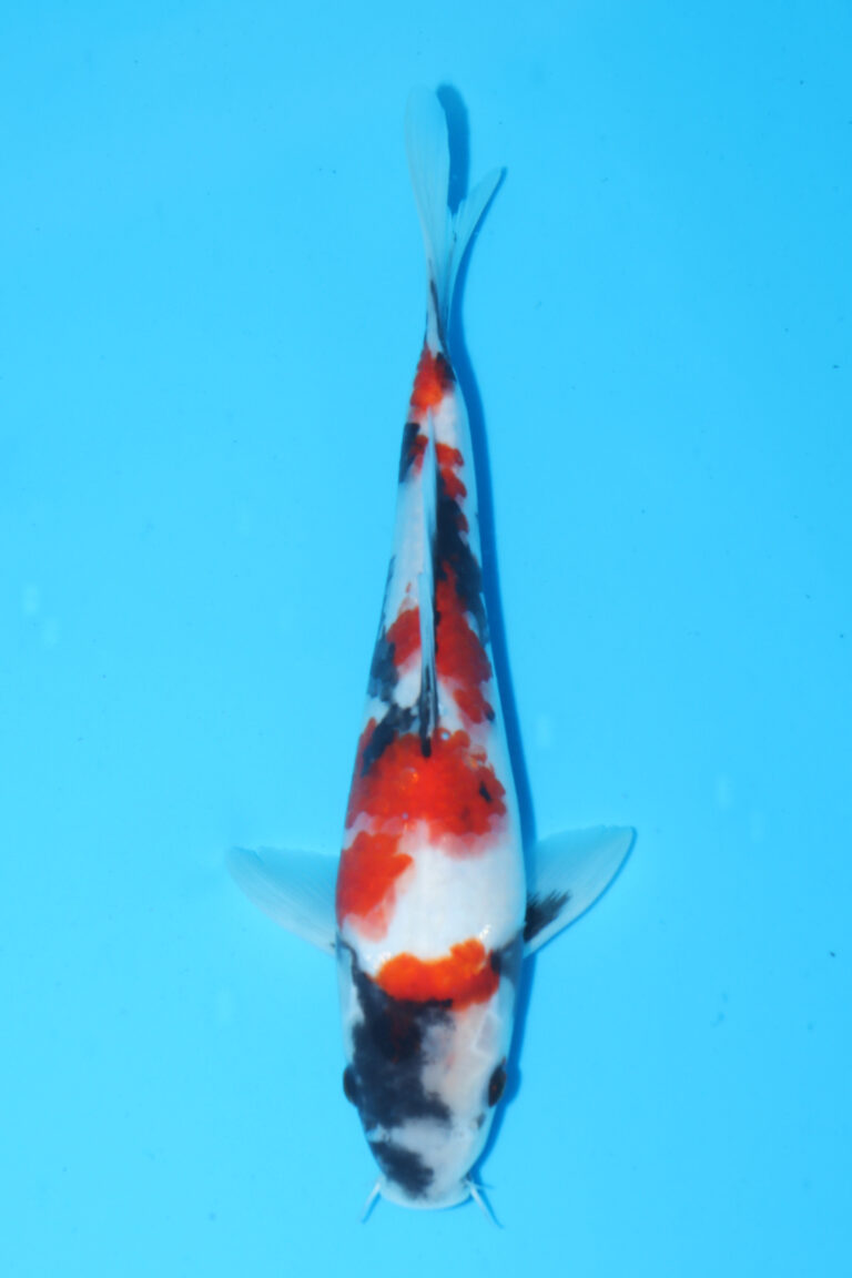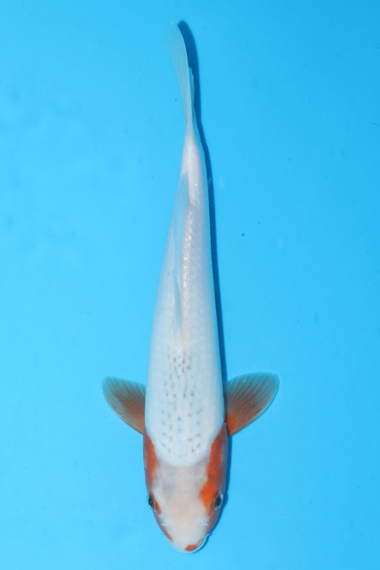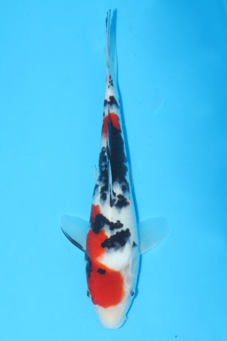 Great head to tail beni pattern, with plenty of sumi to come through. Some sumi starting to show in the pecks, this should improve as its Takeda bloodline. This koi will come with a breeders certificate. Our prices for Tamaura koi are very competitive, due to the volume of nice koi we buy from there. This will look impressive when the sumi comes through.